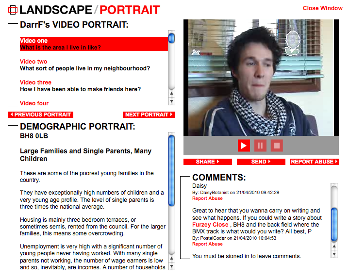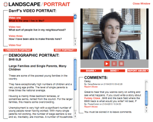 This screengrab shows how the video portraits appear on the Landscape/Portrait site. At the bottom left of the window is the demographic portrait for the participant’s full postcode, as generated by CACI’s ACORN programme, while at the bottom right is the comments box, in this case showing a comment by the Postal Coder simulation.
