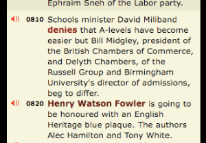 The first two minutes or so of the segment feature writer Alec Hamilton talking about Henry W. Fowler of Fowler’s Modern Usage fame. Around 47-seconds in you will hear a slight rattle as might be produced for example if a china coffee cup were set down in some immediately regretted moment of absent-mindedness onto a glass-topped coffee table in a former Soviet sphere Baltic hotel room. There is one small victory in there too, in that I was able to say, uncontested, on the Today programme that Linton Kwesi Johnson is one of the most important British writers of the last 40 years. I still don’t know quite why I said that, because I think he is possibly the most important British writer of the last 50.