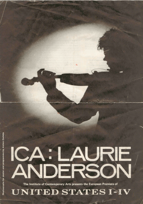Not so obscure as it sounds. Those performances were quite a big deal at the time. Anderson had just had a huge hit in the UK with ‘O Superman’, and her epic performances over two nights of the 8-hour United States I-IV were promoted by the ICA at the Dominion Theatre, London in February 1983. I went along. Here is a scan of the programme. It has probably survived the years so relatively unscathed because I stored it inside a record sleeve.