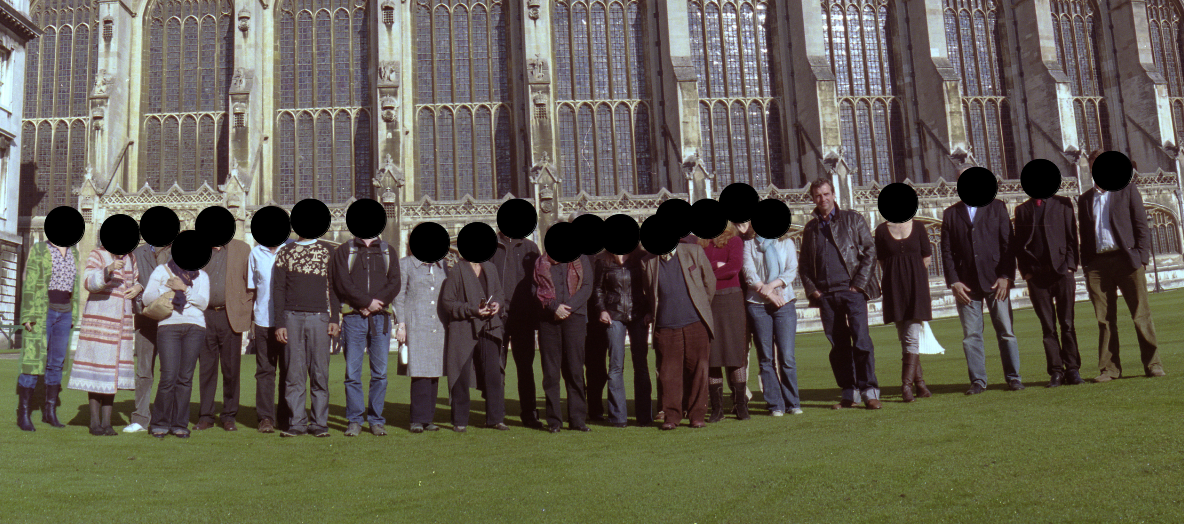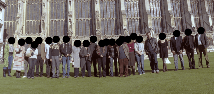 Because the Arts and the Law seminar series was conducted according to the so-called Chatham House rule (to encourage openness and the sharing of information within the group at least) I’m apparently bound not to reveal the ‘identity [or] the affiliation of the speaker(s), nor that of any other participant’. So it was initially a bit frustrating when the artist Manu Luksch sent a fantastic panoramic photograph of seminar participants, which I wanted to reproduce at the top of this post. Then I realised that I could comply with the Chatham House rule by anonymising everyone in the spirit of Manu’s excellent surveillance footage sci-fi film of the same year, Faceless.