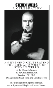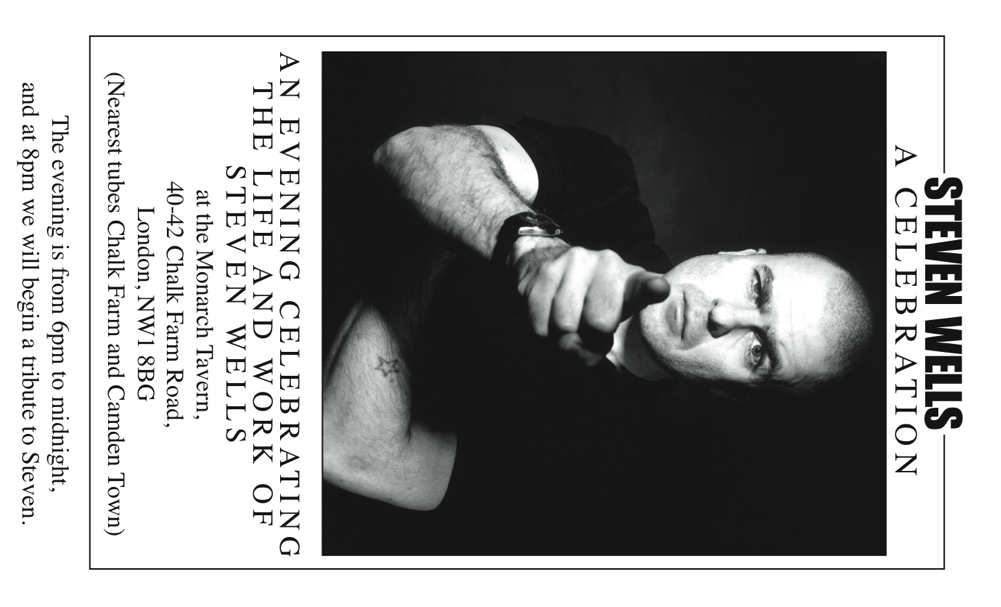 Following the terrible news of Swells’s untimely death in June 2009, I was honoured to give brief presentations and readings at a couple of events that were held to celebrate his life and work. First was an ATTACK! Books tribute night organised by 3:am Magazine, where I read alongside fellow novelist and ATTACK! author Stewart Home (who had first switched Swells on to Road Rage! when it came out). Secondly at a much larger celebratory event put together by David Quantick and NME colleagues, at the Monarch Tavern, Chalk Farm Road, London NW1. Here’s a jpeg of the invite (left).