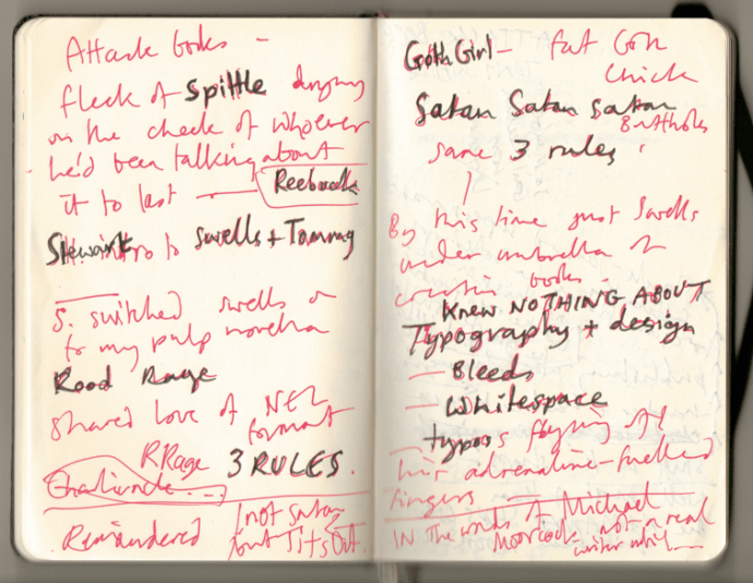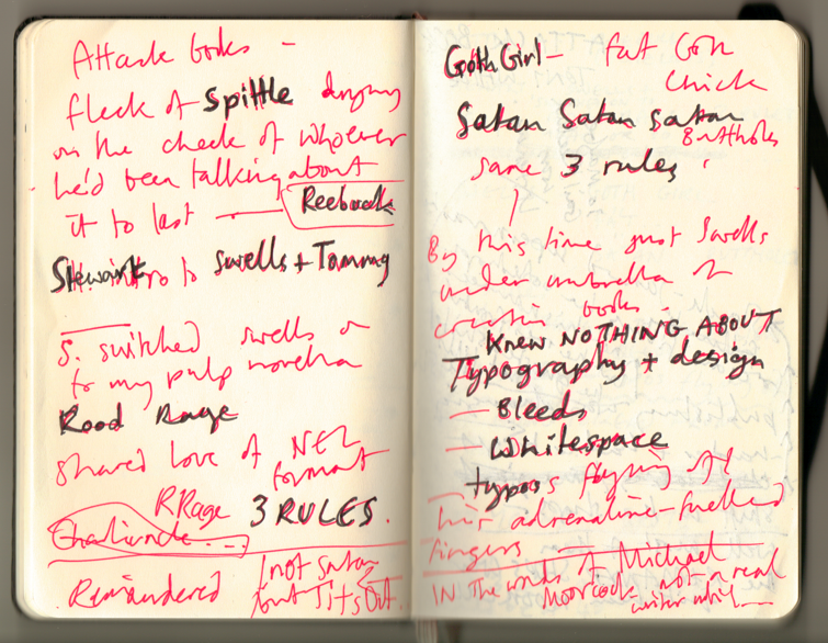 I’ve scanned in the scribbled notes I used for those events below. At the Monarch I didn’t read from Satan! Satan! Satan!, my novel for ATTACK! Books, which Swells once gleefully described as ‘the worst-researched music book ever – OFFICIAL!’, but from a gloriously gratuitous motorway pile-up rant on p.38 of Swells’s own Tits Out Teenage Terror Totty. It’s a typical Swells piece, complete with jibes at everyone from New Labour to Loaded magazine and jingly-jangly indy bands. In that context it felt appropriate to hear Swells’s words spoken aloud — even though I had to apologise for reading his blistering prose at 33 and 1/3 rather than the original 45 RPM. My excuse was that I took breaths.