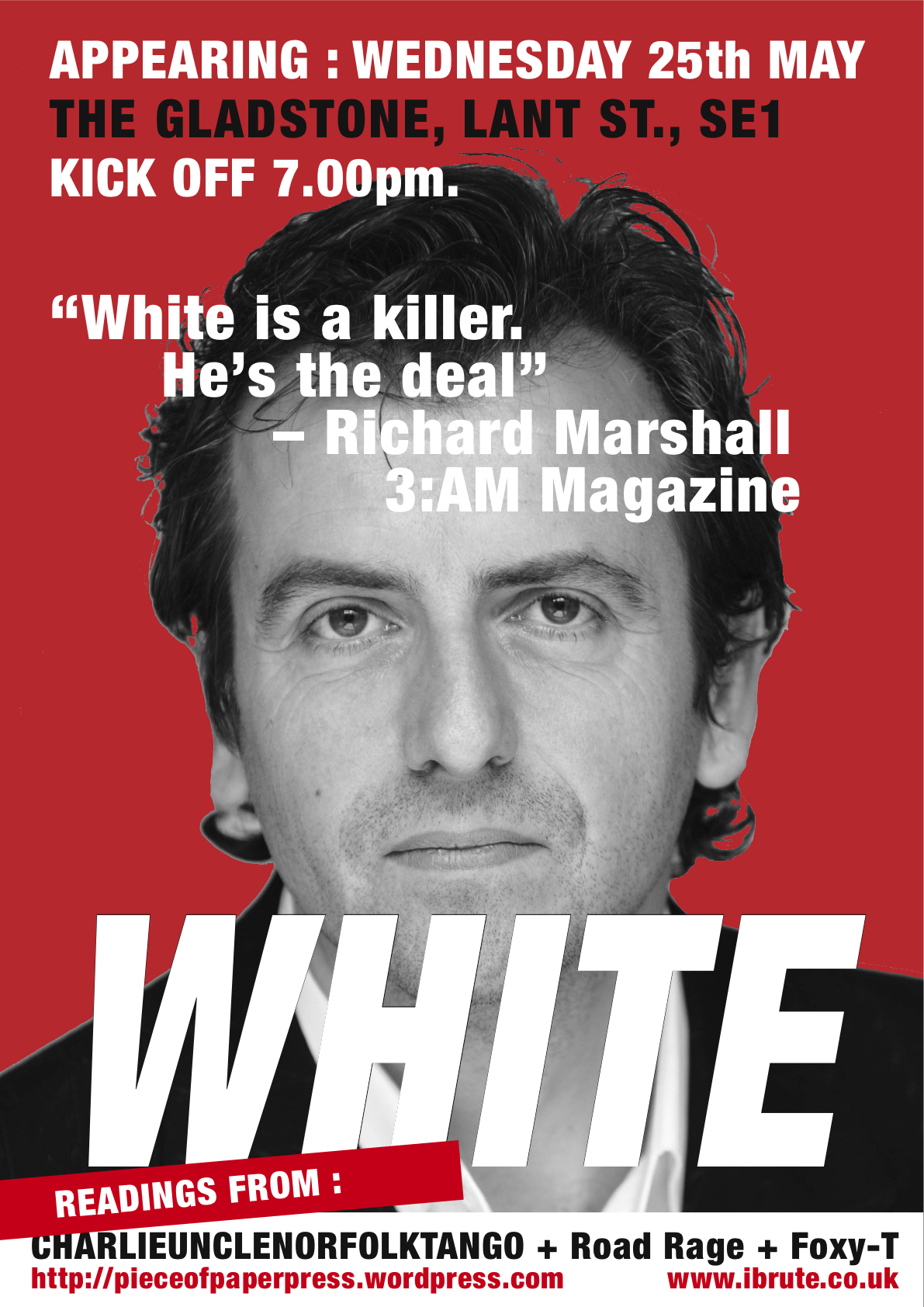 I’m looking forward to doing another reading with the mighty Malcolm Bennett of BRUTE! fame, and Melissa Mann, on Wednesday 25 May at The Gladstone Arms, off Borough High Street, London SE1. One of the perks of doing a gig with Malcolm — aside from the fact that he’s a great performer — is that I get an updated version of my flyer ‘in the BRUTE! style’ (right).