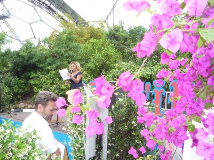 As part of all this, the poet Salena Godden and I traveled down to the Eden Project in Cornwall to read in the verdant splendour of the Eden Project’s Biotik stage. The gig was part of The Eden Sessions arts and music programme. It was great fun to share a gig with Salena of course, and the lush surroundings made this one of the more surreal venues I’ve read at over the years. Sweat dripped amidst the citrus trees and sunflowers, while above our heads swallows darted and swerved beneath the giant honeycomb structures of the geodesic dome, but the artificially stabilised climate and the raised temperature of Eden’s Mediterranean Biome were in marked contrast to the extreme weather that had been hitting much of the UK that same day, the widespread flooding caused by which was all too evident from the train the next day.