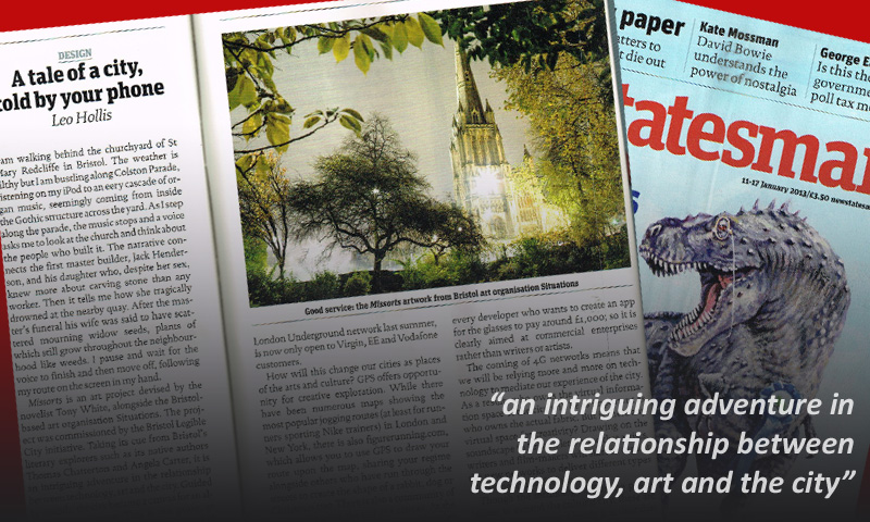 Situations sent through this scan of Leo Hollis’s article on Missorts for the New Statesman, which approaches the project from a technology/policy angle. I’ve blogged about the ideas, process and creative background to Missorts here, here, and here, and posted some of Max McClure’s great images of the launch here. The app which activates the soundwork on iPhone or Android phones in the Redcliffe area of Bristol can be downloaded free here. If you do not have a smart phone, you can use a library card to borrow a pre-loaded phone from Bristol’s Central and Bedminster Libraries. You can also download a free copy of my new novella Missorts Volume II from the site, to read on screen or on most ebook devices.