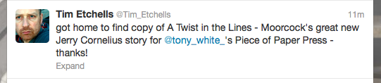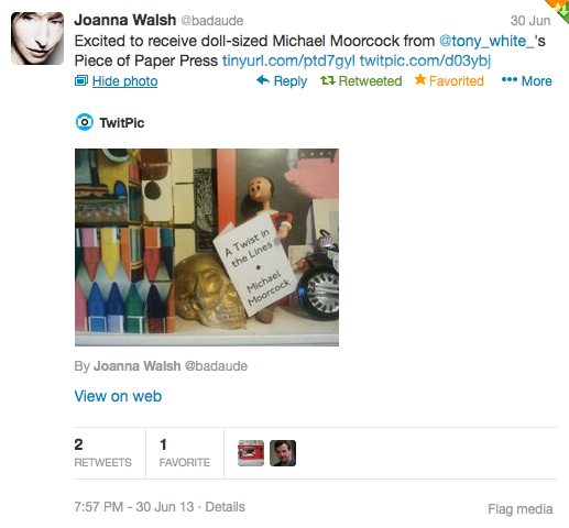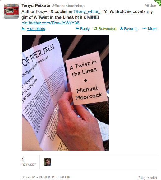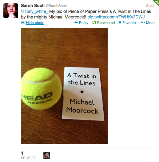 I’ve been enjoying people’s tweets and photos as they receive their copies of the Piece of Paper Press edition of ‘A Twist in the Lines’ by Michael Moorcock. Here is a selection. My favourite has to be @badaude’s ‘doll-sized’ photo, featuring Olive Oyle.
