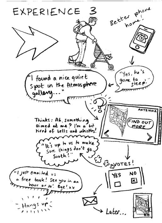 The concept of this as a reader experience came first, before we knew if it was achievable. In the earliest stages of the commissioning process, the Museum asked me to think about how visitors might encounter and engage with the novel, so I had a bash at drawing some ‘experience maps’ to show how I thought it might work. Here are two of those sketches. An existing Museum system (the Antenna news service) already allowed visitors to email themselves a static HTML page, and I initially thought we might need to piggyback on that, but to do so would only have given us a very brief platform in a quickly changing news cycle, so we switched to the idea of visitors emailing themselves from a dedicated terminal. This raised its own technical challenges and for a while it seemed to be touch and go if it could be made to work at all.
