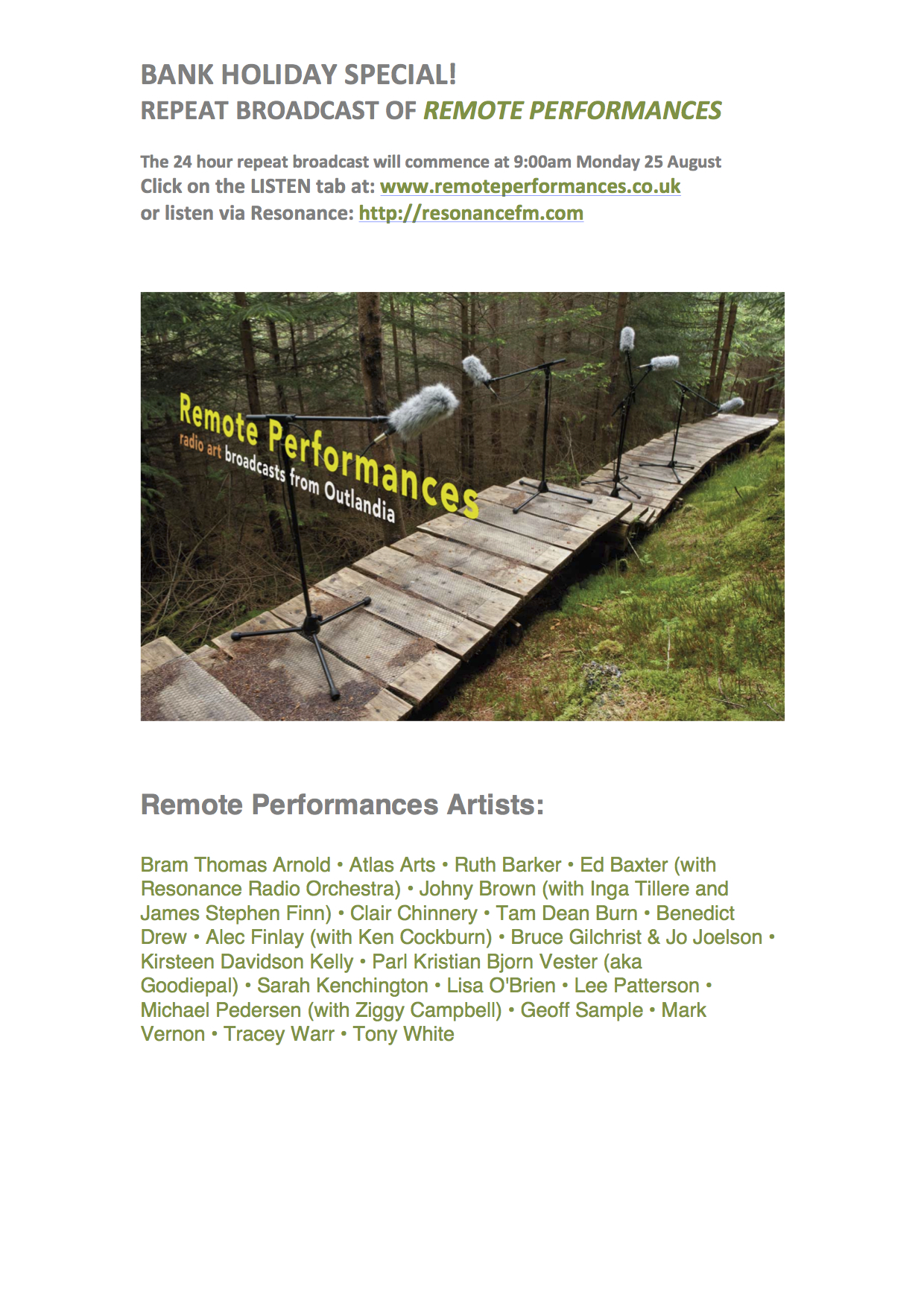 Tagged with Alec Finlay (with Ken Cockburn), Atlas Arts, Benedict Drew, Bram Thomas Arnold, Bruce Gilchrist & Jo Joelson, Clair Chinnery, Ed Baxter (with Resonance Radio Orchestra), Geoff Sample, High-Lands, Johny Brown (with Inga Tillere and James Stephen Finn), Kirsteen Davidson Kelly, Lee Patterson, Lisa O'Brien, London Fieldworks, Mark Vernon, Michael Pedersen (with Ziggy Campbell), Outlandia, Parl Kristian Bjorn Vester (aka Goodiepal), Remote Performances, Resonance 104.4fm, Ruth Barker, Sarah Kenchington, Stormbringer, Tam Dean Burn, Tony White, Tracey Warr