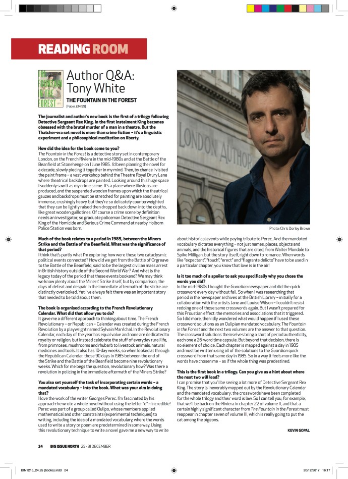 Tagged with AUTHOR Q&A, Big Issue, Big Issue North, Faber, Faber and Faber, Interview with Tony White, Q&A, Reading Room, The Fountain in the Forest, Tony White, Tony White interviewed