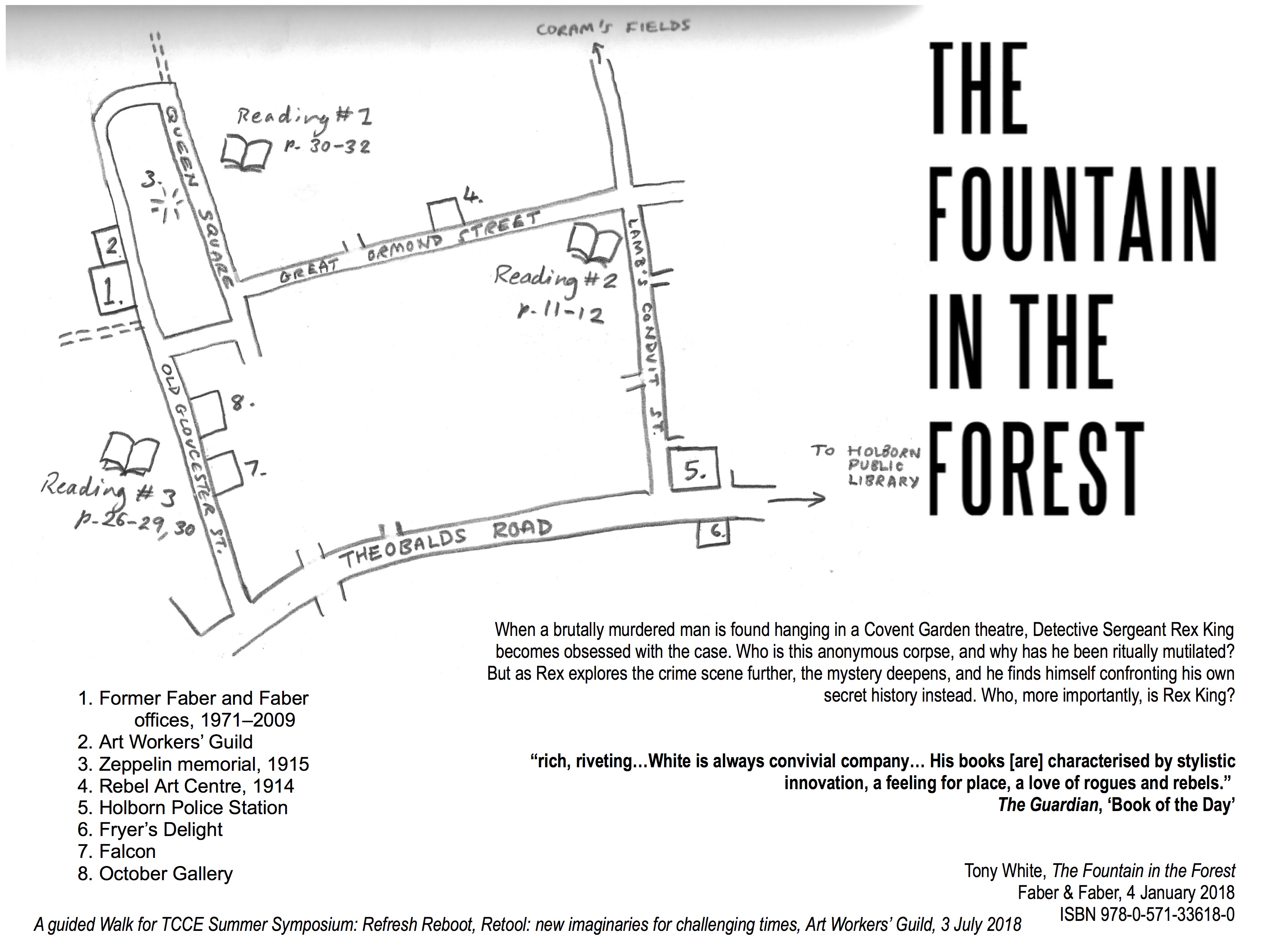 I was delighted to have the opportunity to devise a guided walk (with readings) around the block in Holborn, London, of locations from my novel The Fountain in the Forest, which took place yesterday, 3 July, as part of a Summer Symposium, put on by The Culture Capital Exchange (TCCE).