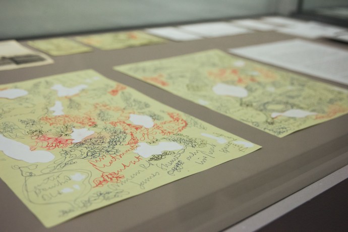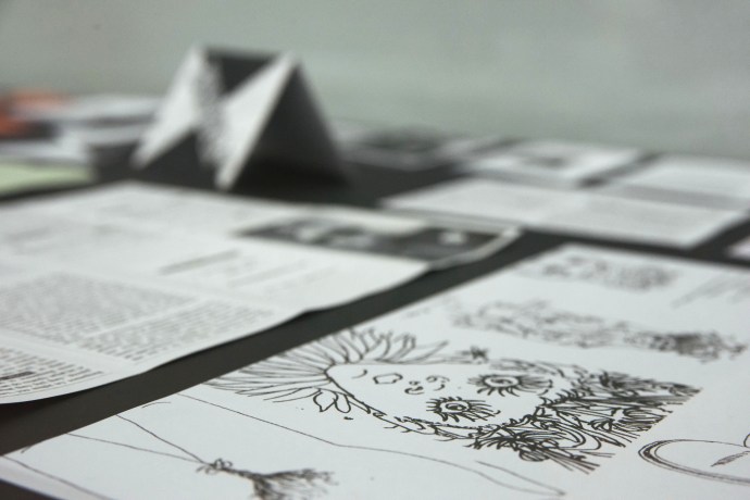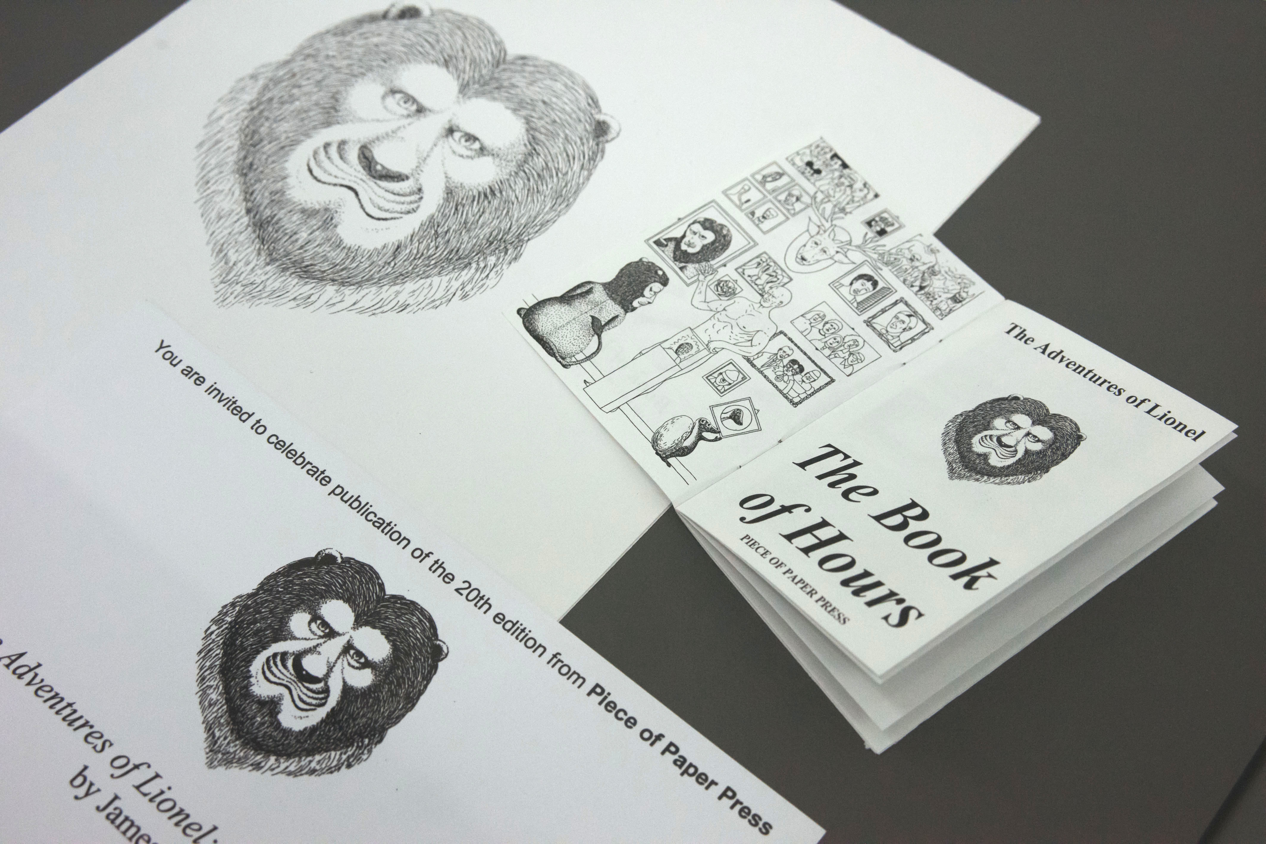 Vitrine 4, close-up: Clockwise from top left: James Pyman, Lionel drawing, (photocopy); James Pyman, The Adventures of Lionel: The Book of Hours; Piece of Paper Press, launch invite. (Photo: Chris Saunders).
