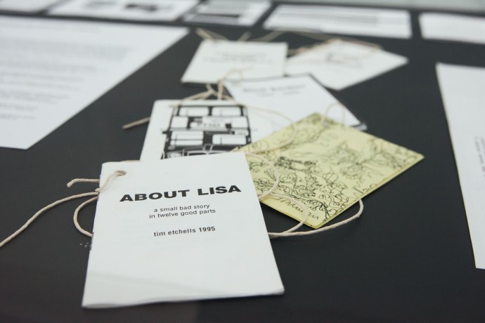 Display view showing Vitrine 1, Back row (L–R): Tim Etchells, About Lisa: a short bad story in twelve good parts (POPP.004, 1995), Penny McCarthy, Bedrooms (POPP.005, 1995). Front (L-R): Tony White, Title Track – print-ready artwork. Tim Etchells, About Lisa – print-ready artworks. Annotated draft press release for Penny McCarthy, Bedrooms. Press release for Tim Etchells, About Lisa. (Photo: Chris Saunders)