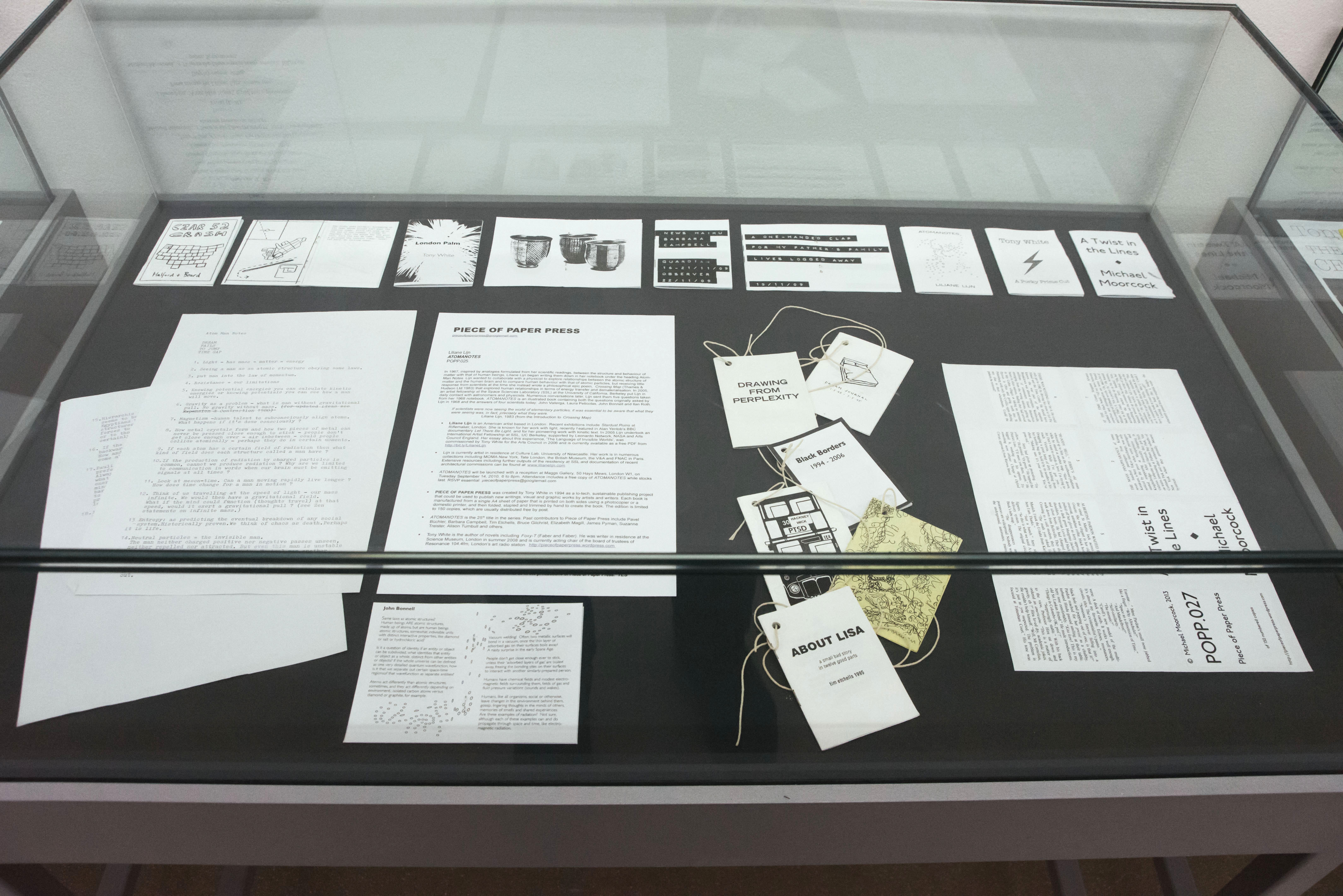 Vitrine 5, Back row (L–R): Halford + Beard, Czar 52 Crash (POPP.022, 2009), Tony White, London Palm (POPP.023, 2009), Barbara Campbell, News Haiku (POPP.024, 2009), Liliane Lijn, Atomanotes (POPP.025, 2010), Tony White, A Porky Prime Cut (POPP.026, 2011), Michael Moorcock, A Twist in the Lines (POPP.027, 2013) – un-numbered, showing production damage. Front (L–R): Liliane Lijn, ‘Atom Man Notes’, typed text – photocopy. Press release for Liliane Lijn, Atomanotes. Liliane Lijn, Atomanotes, page spread. Display copies, string. Michael Moorcock, A Twist in the Lines – print-ready artwork. Inkjet on paper, Spraymount. (Photo: Chris Saunders)