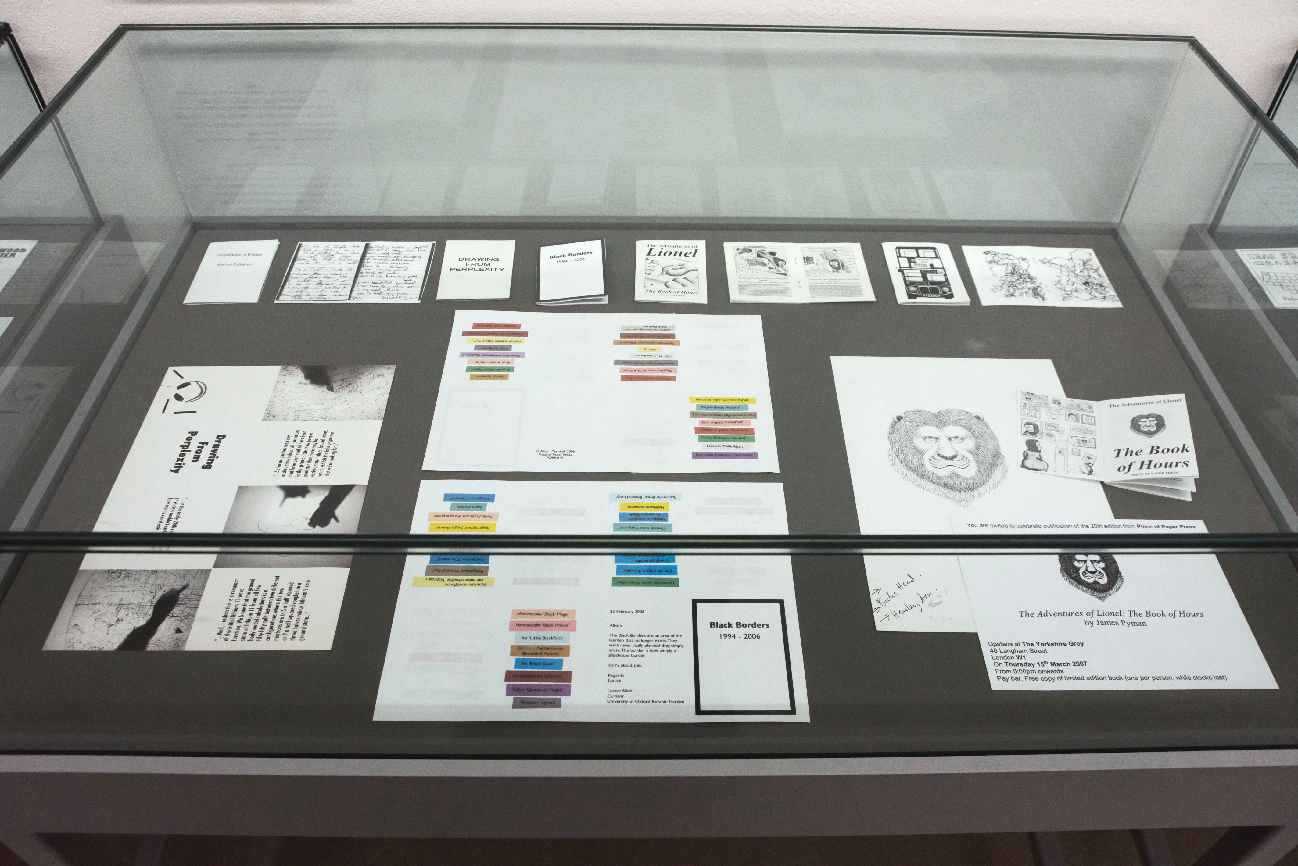 Vitrine 4, Back row (L–R): Borivoj Radaković, Posjetiteljeva Knjiga (POPP.017, 2003), Bruce Gilchrist, Drawing from Perplexity (POPP.018, 2005), Alison Turnbull, Black Borders: 1994–2006 (POPP.019, 2006), James Pyman, The Adventures of Lionel: The book of hours (POPP.020, 2007), Stevie Deas, Cleanskins (POPP.021, 2007). Front (L–R): Bruce Gilchrist, Drawing from Perplexity – uncorrected proof, inkjet on card; Alison Turnbull, Black Borders – unfolded signatures. Bubblejet print; James Pyman – Lionel drawing for title page and event invite. Photocopy. Invitation to celebrate the publication of the 20th edition from Piece of Paper Press, 15 March 2007. Photocopy on card. James Pyman, The Adventures of Lionel: The Book of Hours – page spread. (Photo: Chris Saunders)