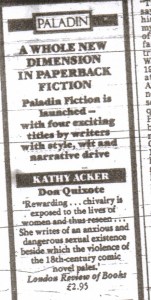 I love this. Kathy Acker’s novel Don Quixote as the lead title in the launch list of one time Collins imprint Paladin’s new mass-market paperback fiction list.