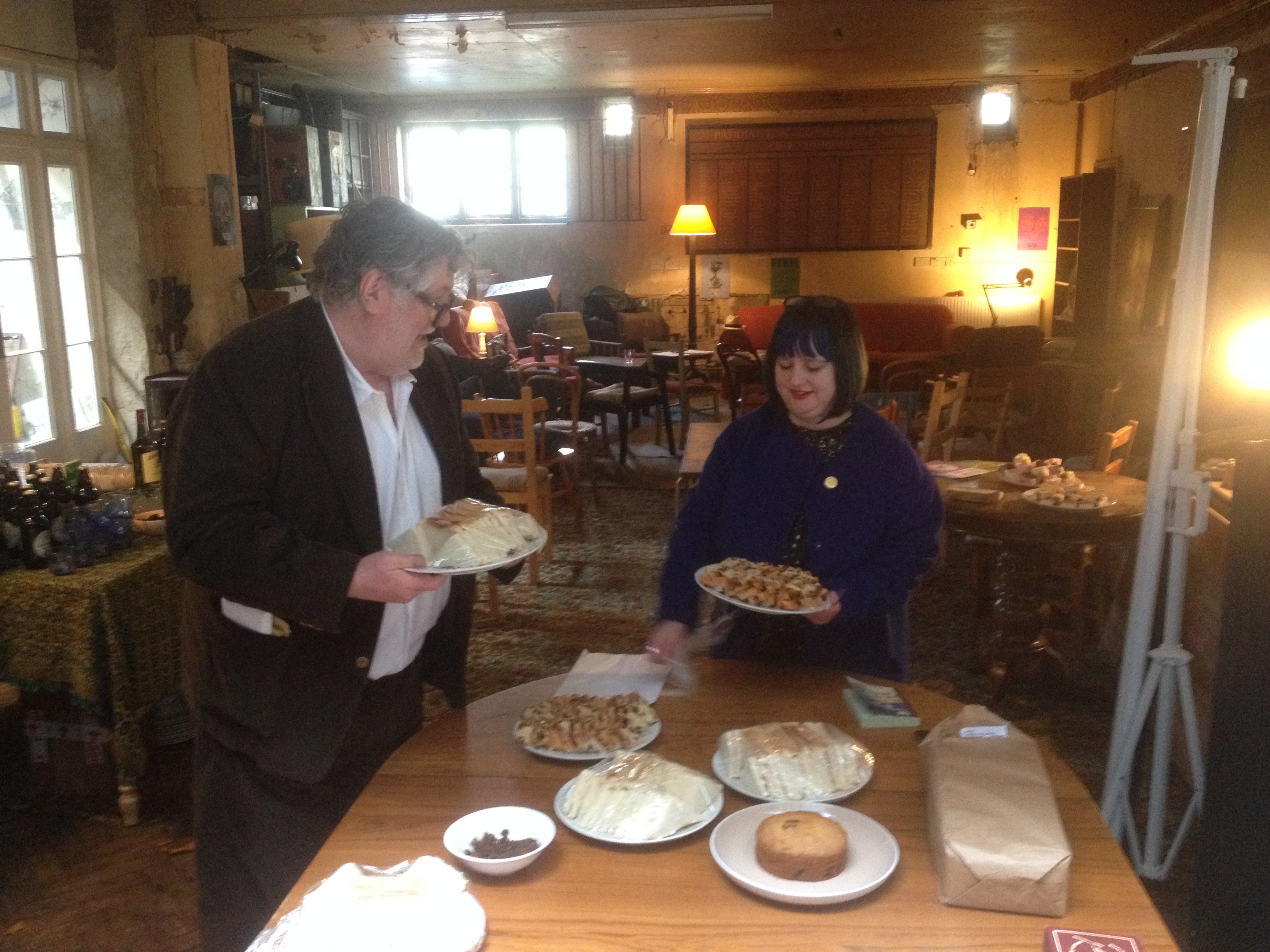 Here is author and critic David Collard – Finneganight’s impressario and Master of Ceremonies – and author June Caldwell, just arrived from Dublin, unwrapping the cheese and ham sandwiches (triangular cut), ‘shop cake’, fig rolls, and black and white puddings. This was the part of the evening where there seemed to be enough Guinness to go around . . .