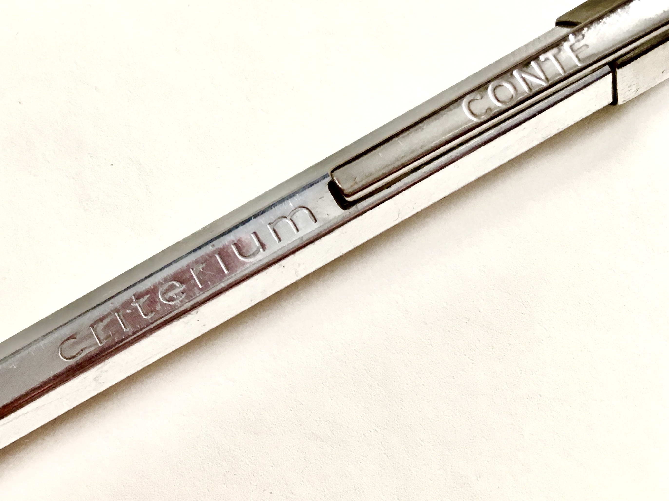 This is a beauty. It’s a vintage Conté Criterium, cast aluminium mechanical pencil, loaded with a 2mm 4B Staedtler lead. This itself was a replacement for a vintage Bic Criterium (found in the deepest recesses of an old stationery shop in Vence, France, ca. 2000) of near-identical design, with cast body, milled grip, etc. although the Bic version – should you be lucky enough to find one – comes unpolished, with a brass cone and unrounded corners (and is thus, to my eye at least, marginally more beautiful).