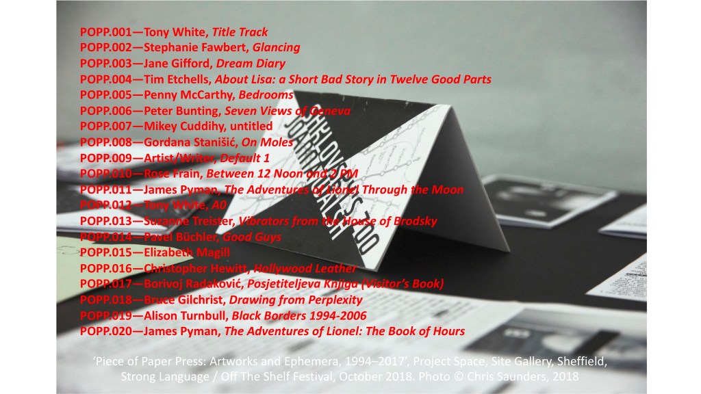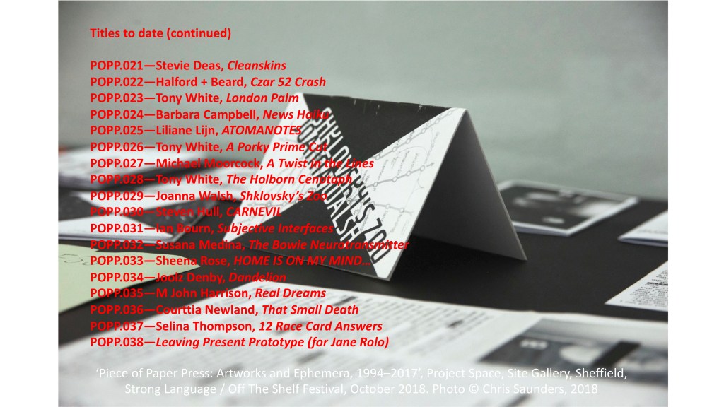 This weekend I was privileged to have been invited to talk about Piece of Paper Press – the artists’ book project I founded in 1994 – for Carthorse Orchestra, David Collard’s online literary gathering. Here are a couple of slides showing the titles published to date. The book in Chris Saunders photo is an untrimmed cover registration test of Joanna Walsh’s Shklovsky’s Zoo, from 2014.