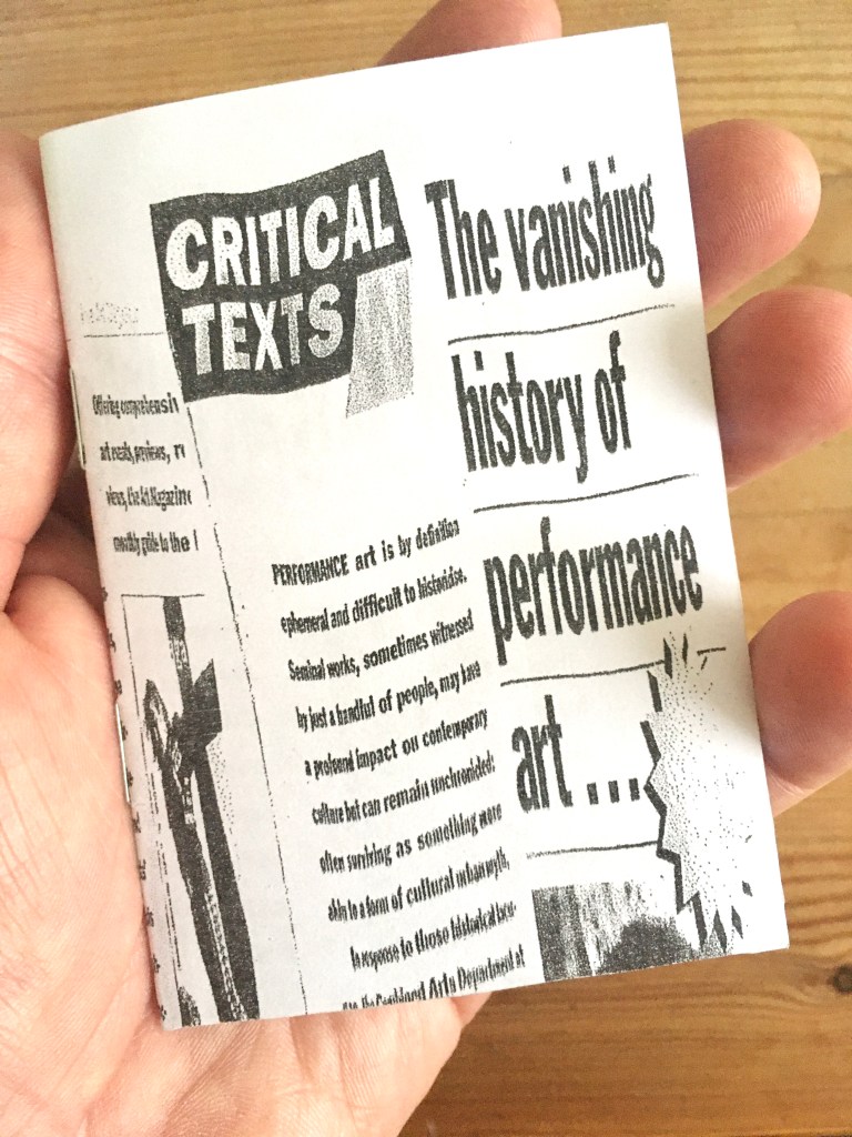 However, I do understand that thanks to a number of people giving their collections to larger institutions, some copies of past titles are available in public and/or accessible collections at UCL Small Press Collections, Chelsea School of Art Library, Arnolfini Archive, and the Live Art Development Agency Reading Room. I should say that until I am able to research this further, I can’t say exactly which titles are where, nor precisely how they have been catalogued.