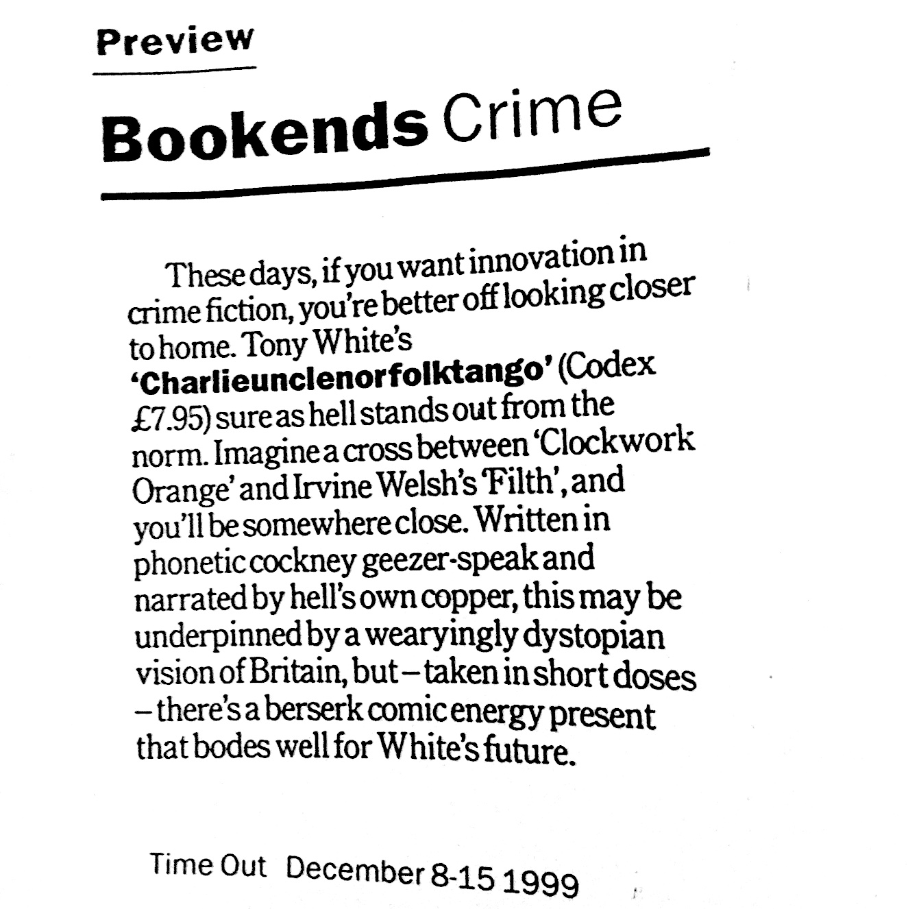 The clipping’s from the days when Time Out still had destination books pages, and an actual Books Editor in post! It’s a review by author John Williams. It was an important magazine at the time, with huge circulation. Everyone used to read it. So it was a thrill to get a brief positive review in John’s then regular/occasional crime fiction round-up. Especially for a confrontational avant garde novel like Charlieunclenorfolktango!
