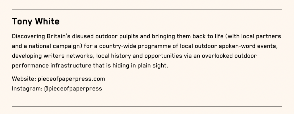 Discovering Britain’s disused outdoor pulpits and bringing them back to life (with local partners and a national campaign) for a country-wide programme of local outdoor spoken-word events, developing writers networks, local history and opportunities via an overlooked outdoor performance infrastructure that is hiding in plain sight.