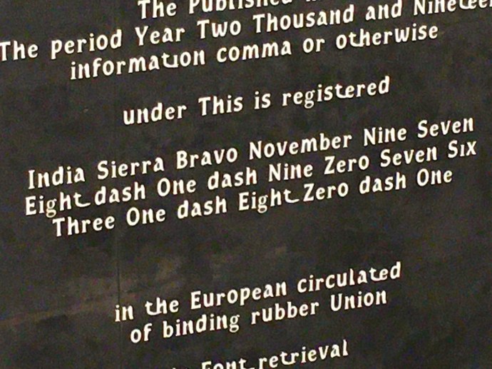 But then, apropos of nothing, Fiona told me that her use of the phonetic alphabet to depict the ISBN was (in her words), ‘inspired by that old book of yours.’