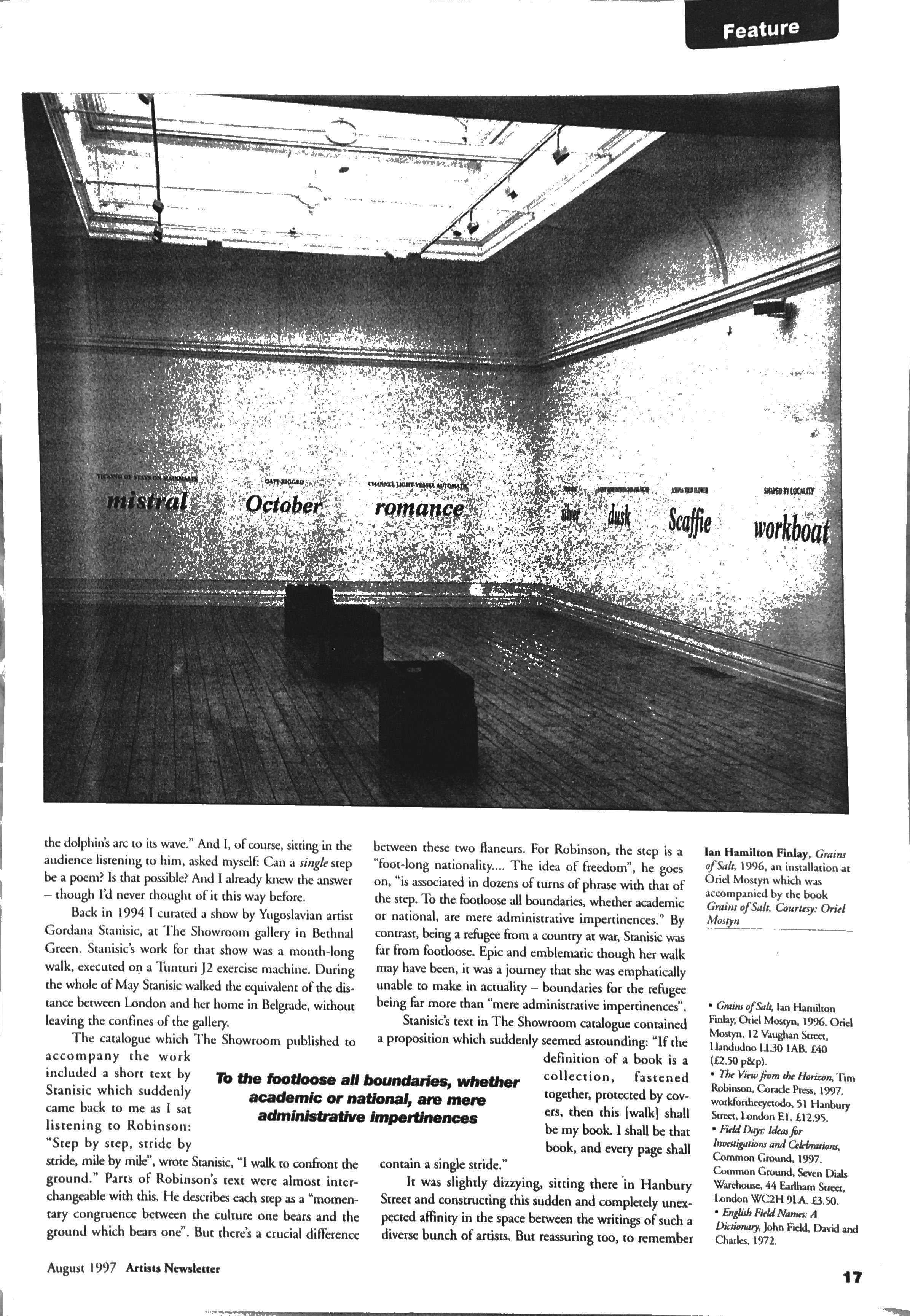Strangely, or perhaps not, I’d already been thinking about Robinson earlier that week. While sorting through some old papers, I’d come across photocopies of a short article of mine for the then Artists’ Newsletter – now AN – from that same year, which mentions Robinson’s reading alongside a number of other books/works by artists including Ian Hamilton Finlay, Gordana Stanišić, and the historian or historical geographer John Field.