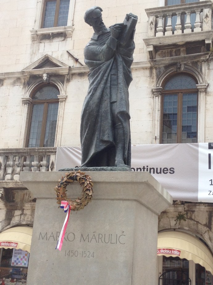 On a large stone plinth outside Školska Knjiga, stands a larger than life-size bronze statue of Marko Marulić himself – the coiner of ‘psychology’ and the father of Croatian literature, after whom the residency programme that has brought me to Split is named. The sculpture is by the renowned 20th century Yugoslavian-era sculptor Ivan Meštrović, and in his imposing vision Marulić holds an open book towards an unseen audience. Traditionally this has been interpreted as representing the great man reading aloud in public. But in the new city of Split, in an historic old town at least that seems to be in danger of losing its bookselling heritage entirely, it almost looks as if a frowning Marulić is pointing at the book quizzically, as if to say, ‘Remember these?’