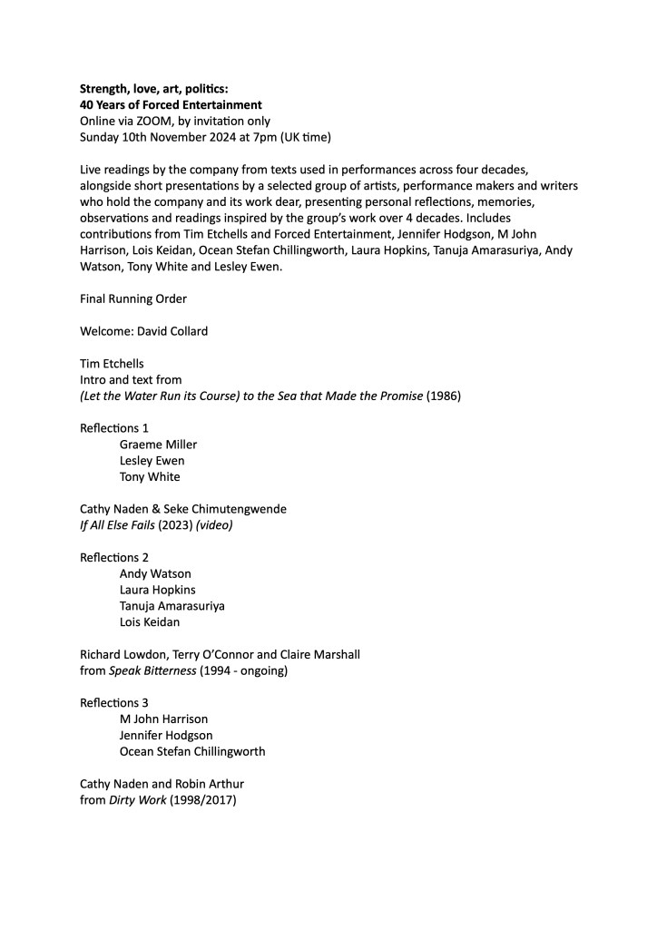 ‘Strength, love, art, politics – 40 Years of Forced Entertainment’ was quite a night: a warm and moving fortieth-anniversary tribute to this preeminent experimental theatre company. I thought readers might like to see this small piece of ephemera, circulated by Forced Entertainment’s Tim Etchells just prior to the event, which took place online on Sunday 10th November 2024: a final running order.