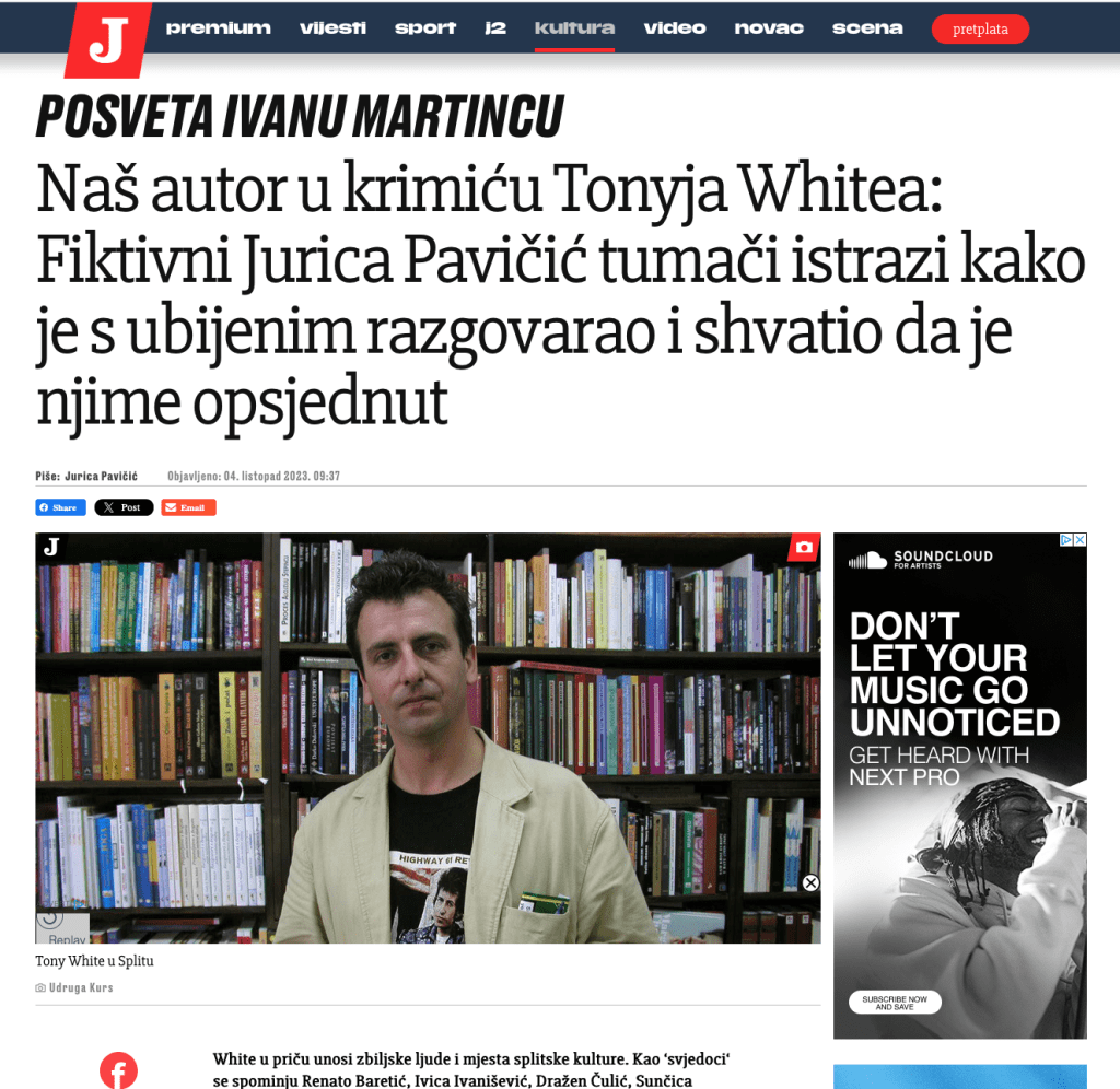 And here comes the interesting part. Recounting a fictional investigation that combs through the Split art scene, White brings real people and places from the culture of the city into the story. They are mentioned as ‘witnesses’ in the story: Renato Baretić, Ivica Ivanišević, translator Dražen Čulić, and the director and president of Split Kino Club Sunčica Fradelić. Even the meeting place of local journalists and writers is mentioned, Konoba Hvaranin and its owner Vinko Radovani. As a literary character, your author too found himself in the story. The fictitious Jurica Pavičić explains to the Croatian-British investigation that he had conversations with the murdered man and realized that he was becoming increasingly obsessed with Martinac. The fictional me and the fictional Fradelić help the investigation to understand the intention of the quote deceased.