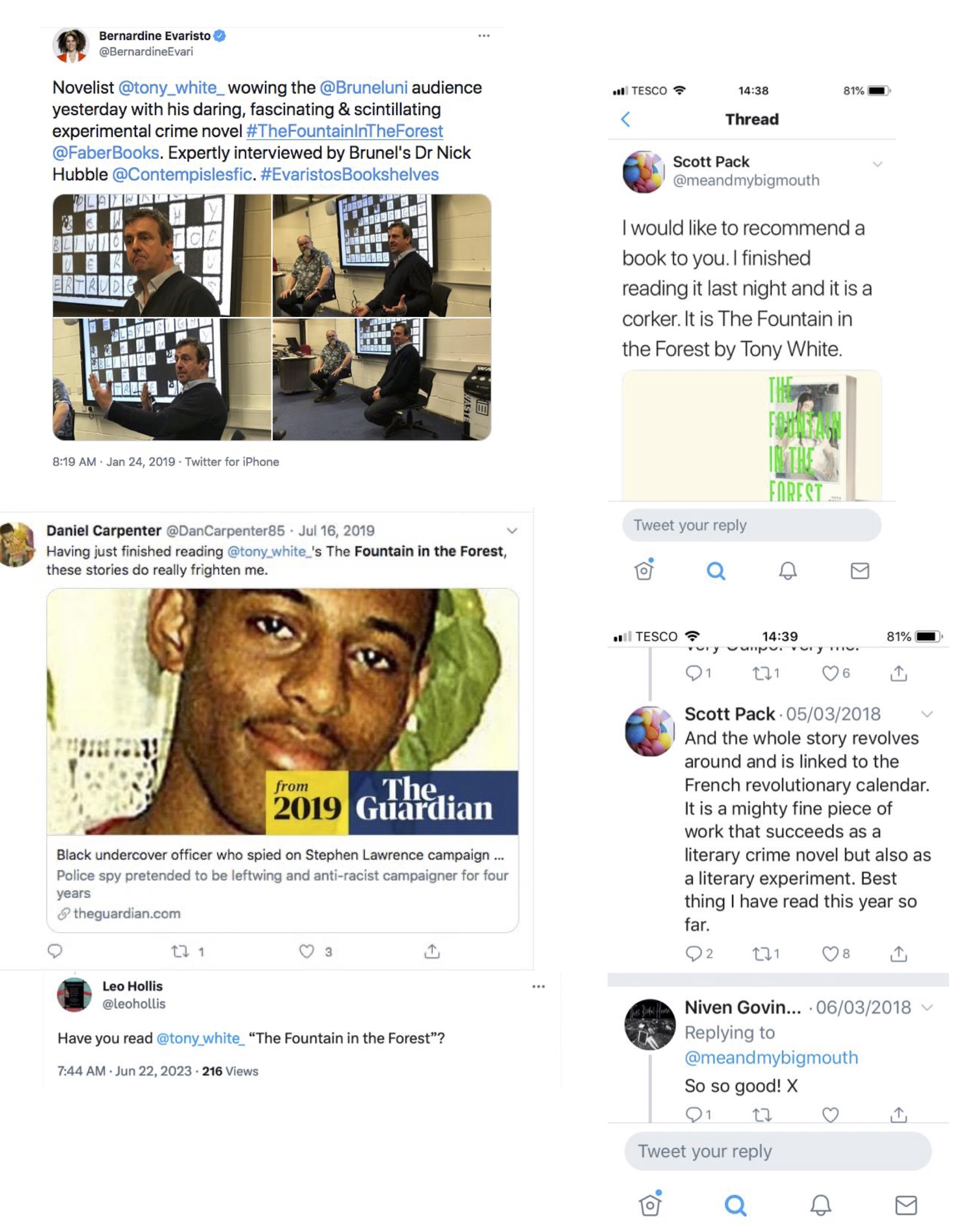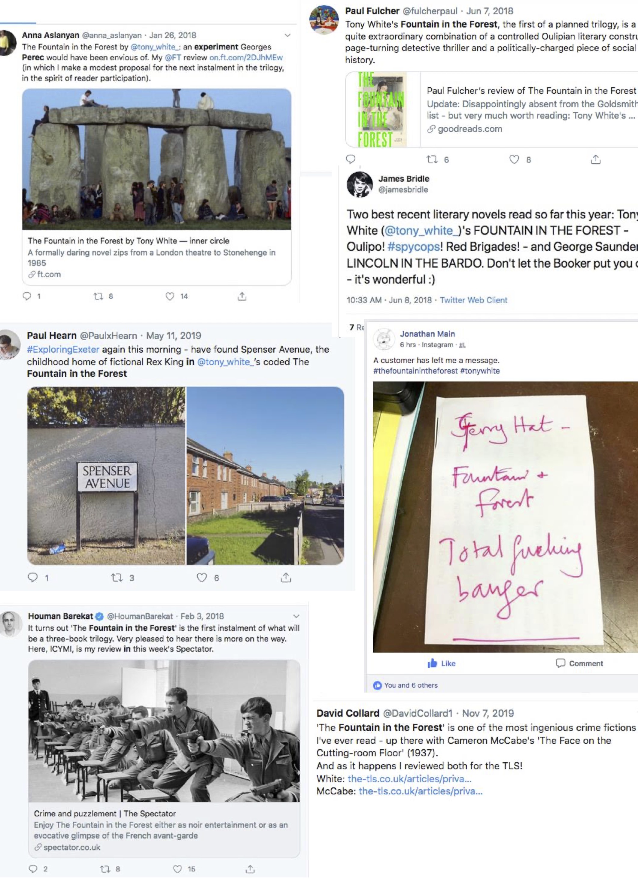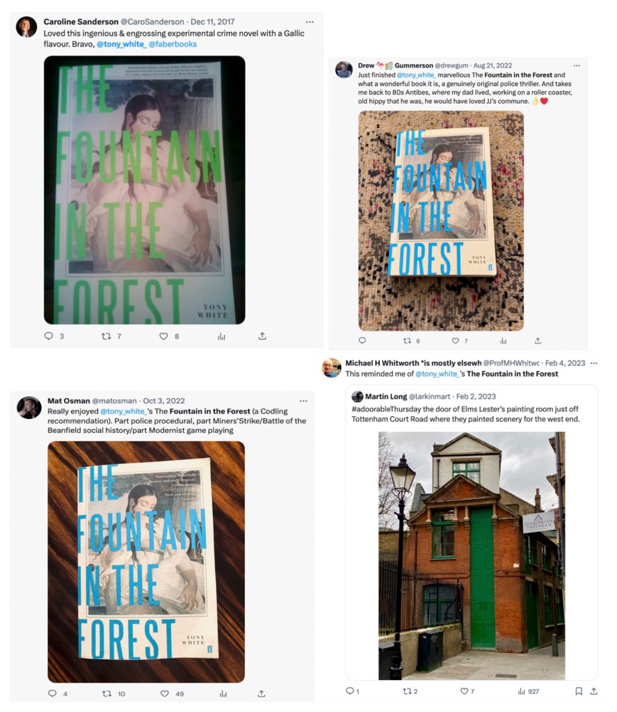 Behind the scenes, occasionally ‘the writing life’™ means applying for things: residencies, fellowships, tendering processes, commissions, open-submission grants and awards, teaching posts, etc. Sometimes the applications are successful, and sometimes they’re not. I pulled together these scrapbook-style screengrabs of tweets and posts about The Fountain in the Forest to paste into a pitching document a while back, and thought they may be of interest here!