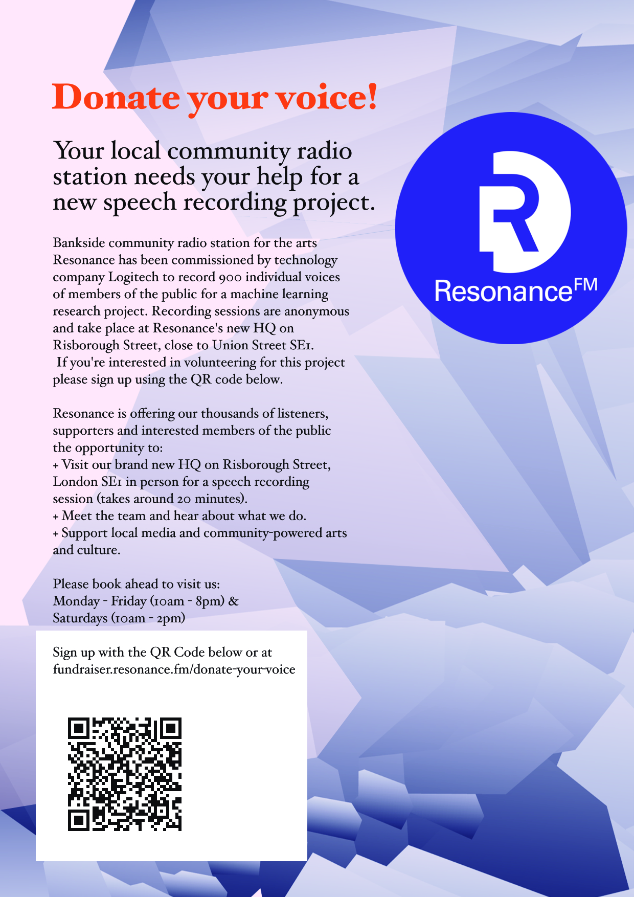 You can help support Resonance FM by going along to the studio and donating your voice. I have already done this. It was a unique experience, and strangely fun… But Resonance still need a further 100–150 participants. The new Resonance studio is just around the corner from Tate Modern, so you can help Resonance on your way to seeing the great Yoko Ono show! Sign up via this QR code or at the link below…