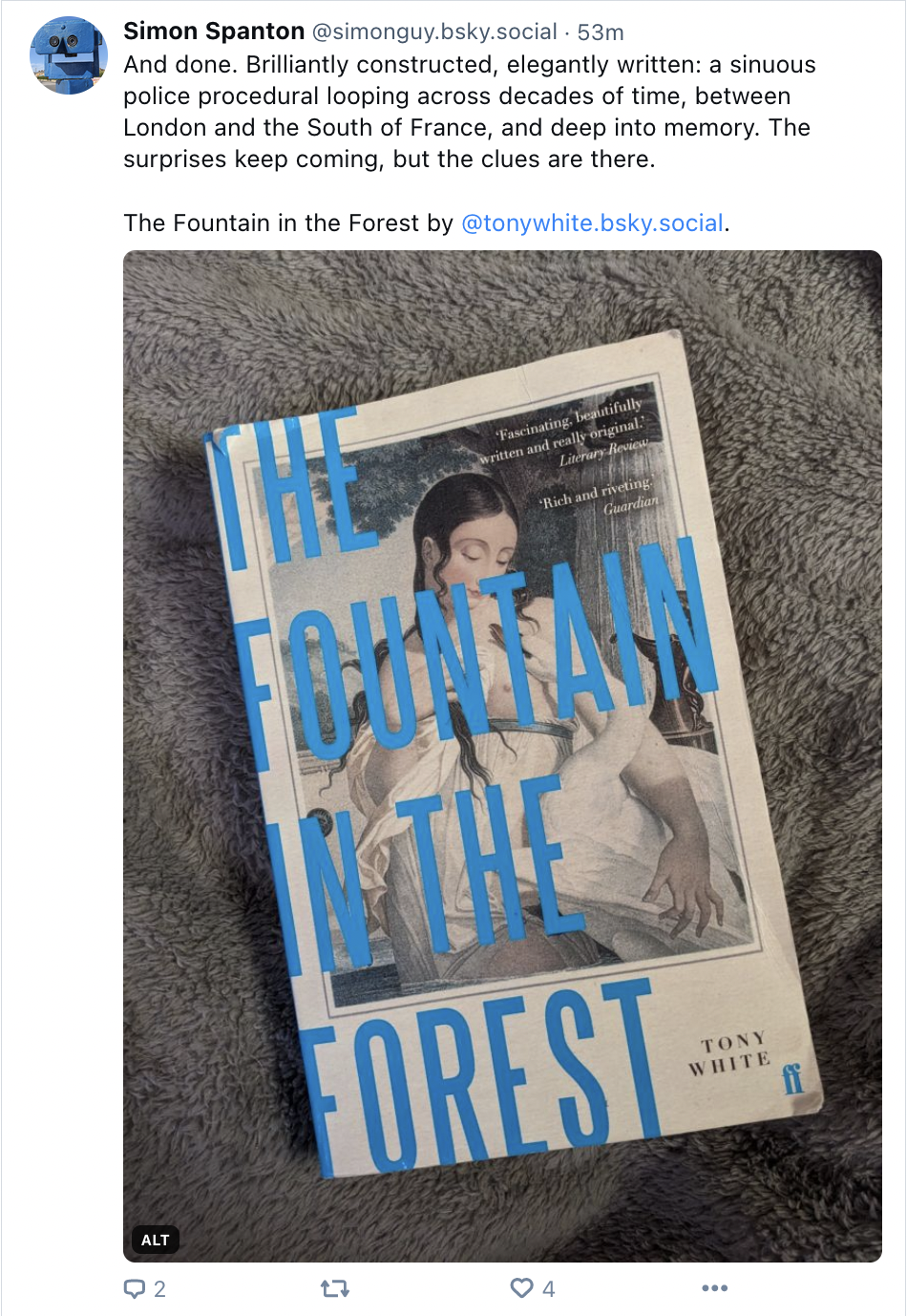 And done. Brilliantly constructed, elegantly written: a sinuous police procedural looping across decades of time, between London and the South of France, and deep into memory. The surprises keep coming, but the clues are there. The Fountain in the Forest by @tonywhite.bsky.social [image or embed]— Simon Spanton (@simonguy.bsky.social) Apr 29, 2024 at 08:36