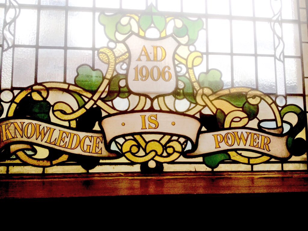 ‘Knowledge is power’ – stained glass window in Twickenham Library – a purpose-built Carnegie Library – photo TW following appearance at Richmond Literature Festival 2019